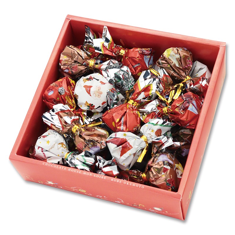 モンロワールの大人気のチョコレートのひとつ「リーフメモリー」が、3色の巾着がセットになった、クリスマスの雰囲気がイメージの限定ボックスです。
