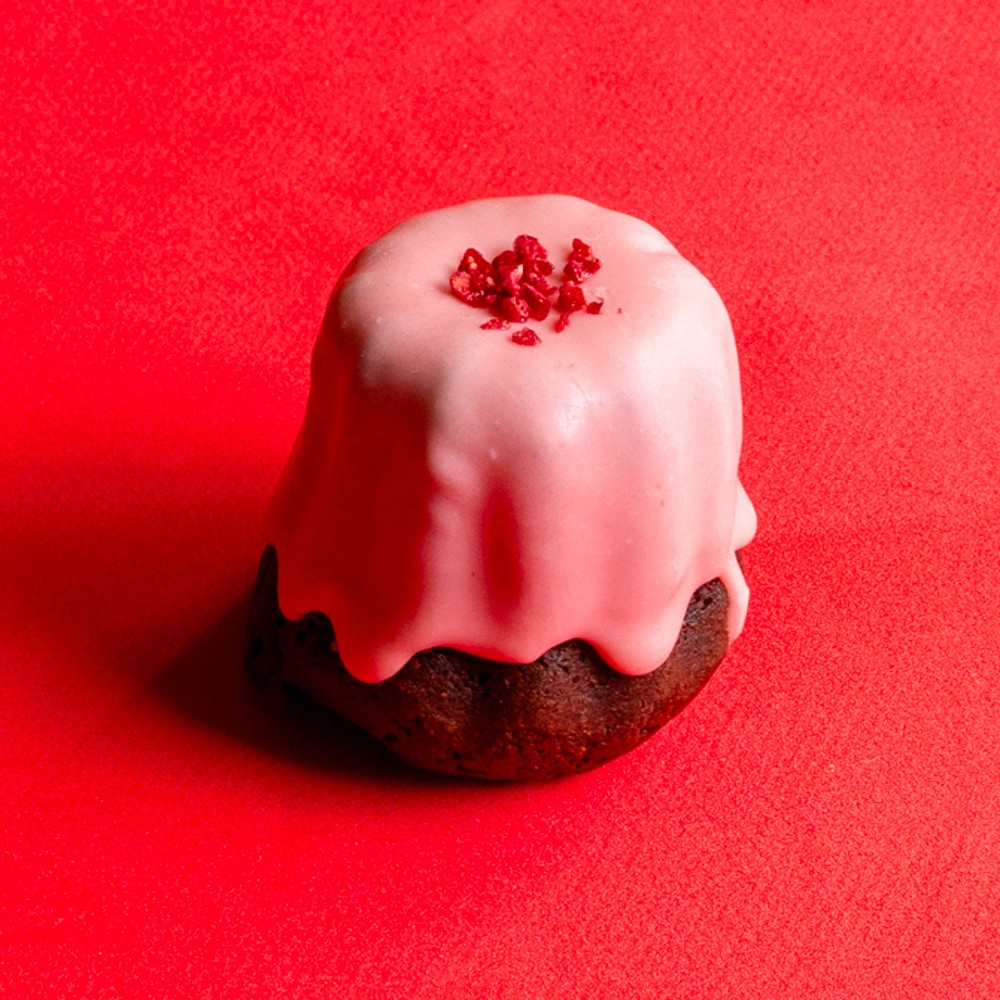 ストロベリー風味のコーティングとラズベリーピースをあしらいました。