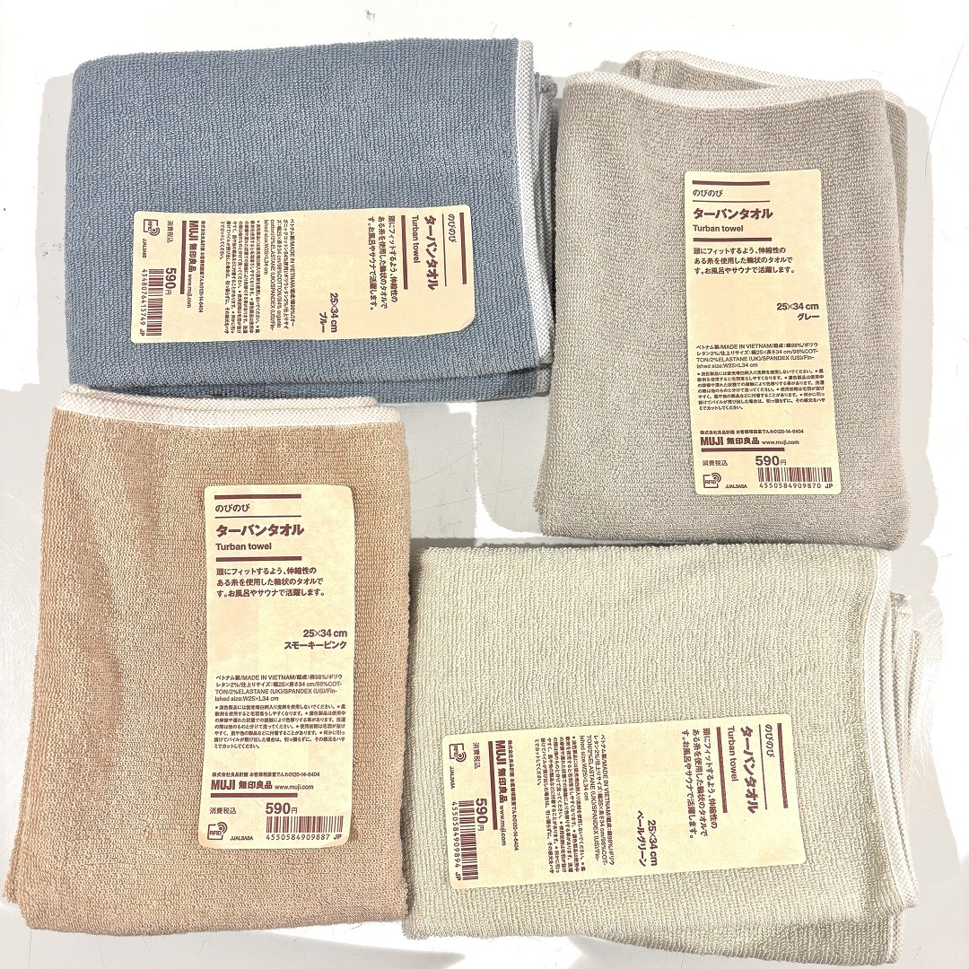 こんにちは、無印良品500 リブ住吉です。『のびのびターバンタオル』 (税込み 590円) は一見シンプルな輪っか状のタオルですが、伸縮性があり、パイル地がふわっふわで、やさしい肌当たりです。グレー、スモーキーピンク、ペールグリーンの3色の中からお好みの色をお選びください。