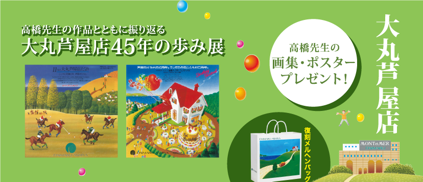 今回、広告の表紙を飾った懐かしい作品をはじめ、大丸芦屋店開店時のセレモニー写真や店内写真、折込広告を、当時のエピソードを交えて展示します。
