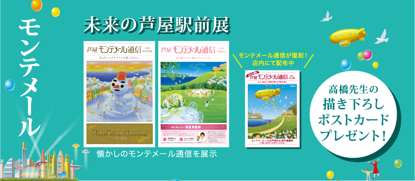 また長年、 高橋宣孝先生によるイラストが表紙を飾った「モンテメール通信」 の懐かしい折込広告を展示。