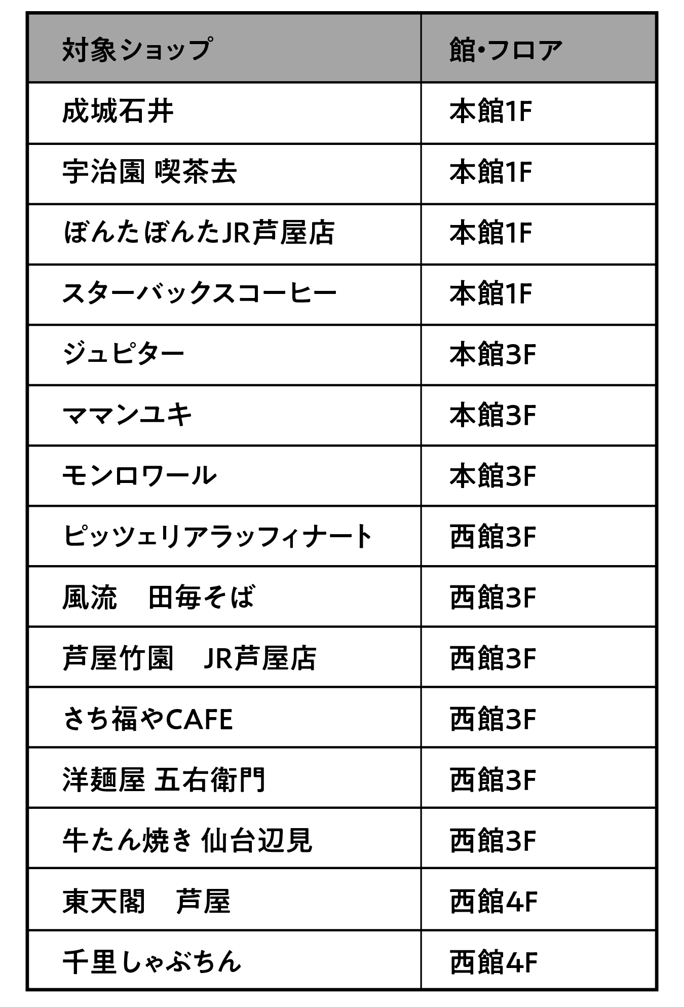 すべて対象になります。お買い上げ店舗・金額の上限はありません。