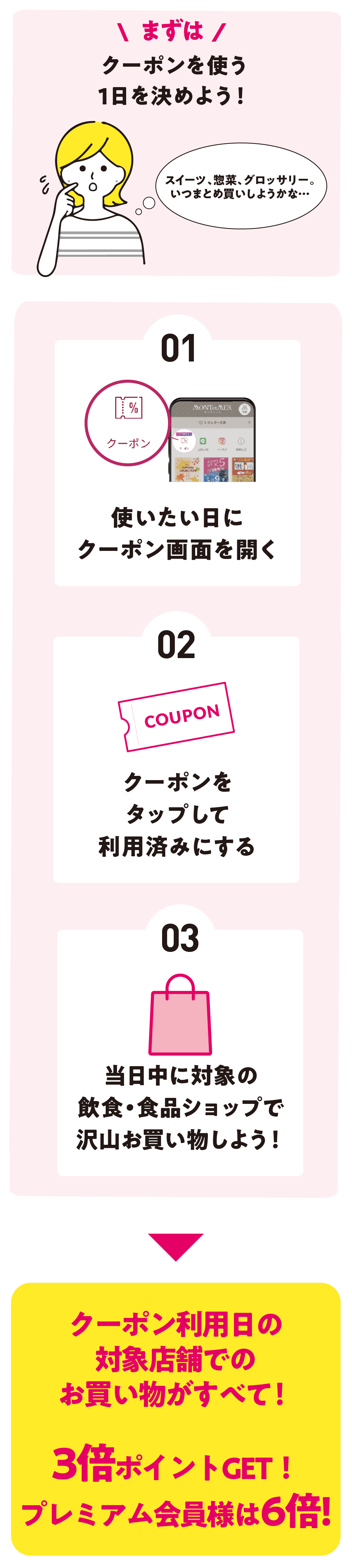 (例)4/3にクーポンを利用済みにすると、4/3のすべての対象食品ショップの買い上げがキャンペーン対象です。