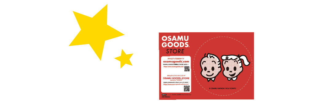 オサムグッズのパネルや装飾写真をInstagramに投稿し、OSAMU GOODS STOREでお会計時に、「キーワード+Instagramの投稿画面」をご提示でオリジナルステッカーをプレゼントします。