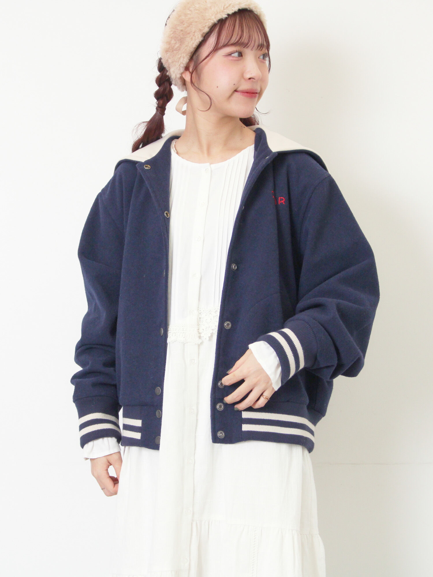 中は落ち着いた色でまとめて、ネイビーのアウターで引き締めるようなコーデにしました.