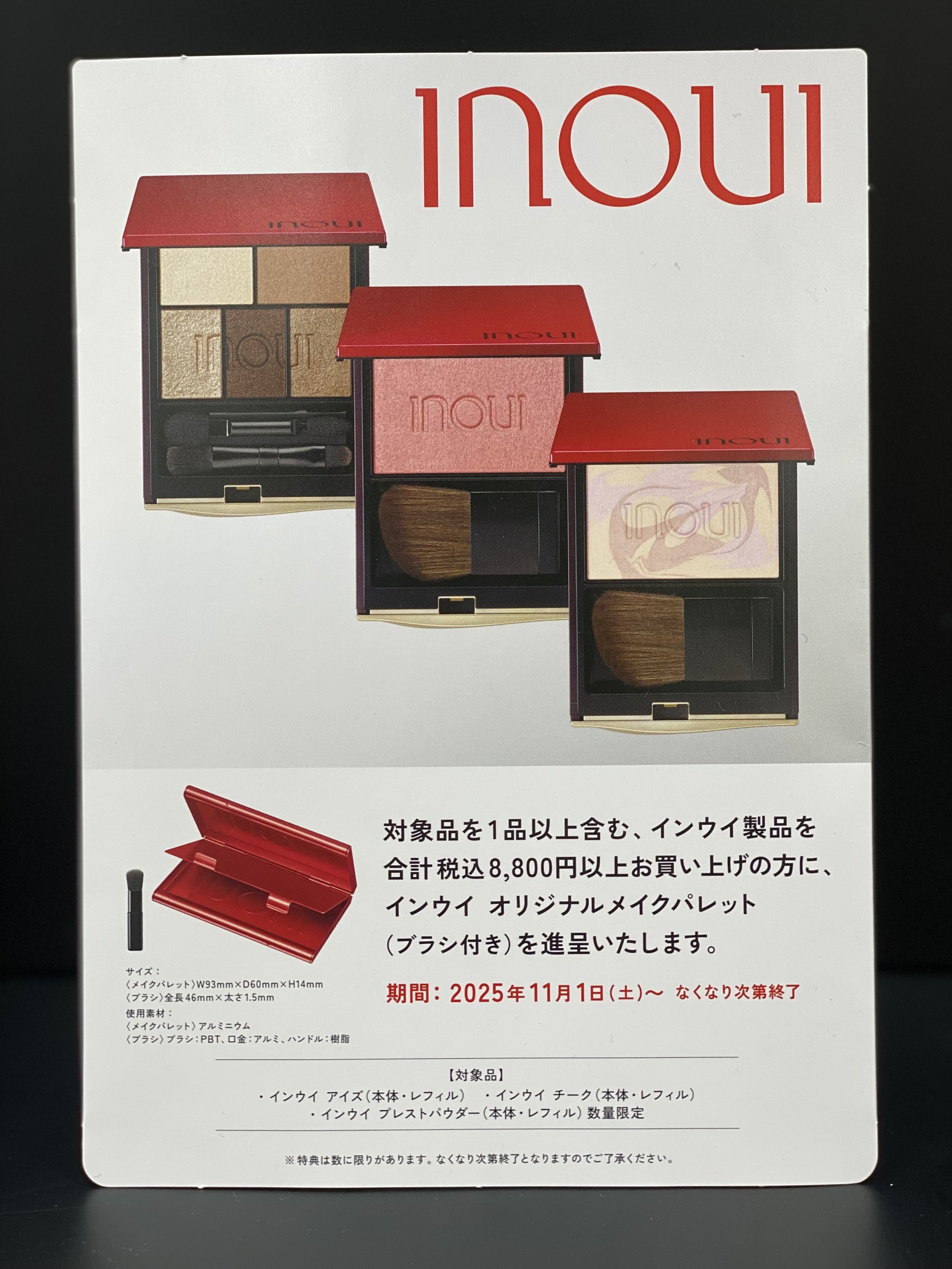 期間中 INOUI❤️の対象商品を1品以上含む、インウイ製品を合計8,800円以上お買い上げの方に、インウイオリジナルメイクパレット🎨💄(ブラシ付き)を進呈致します❣️😊