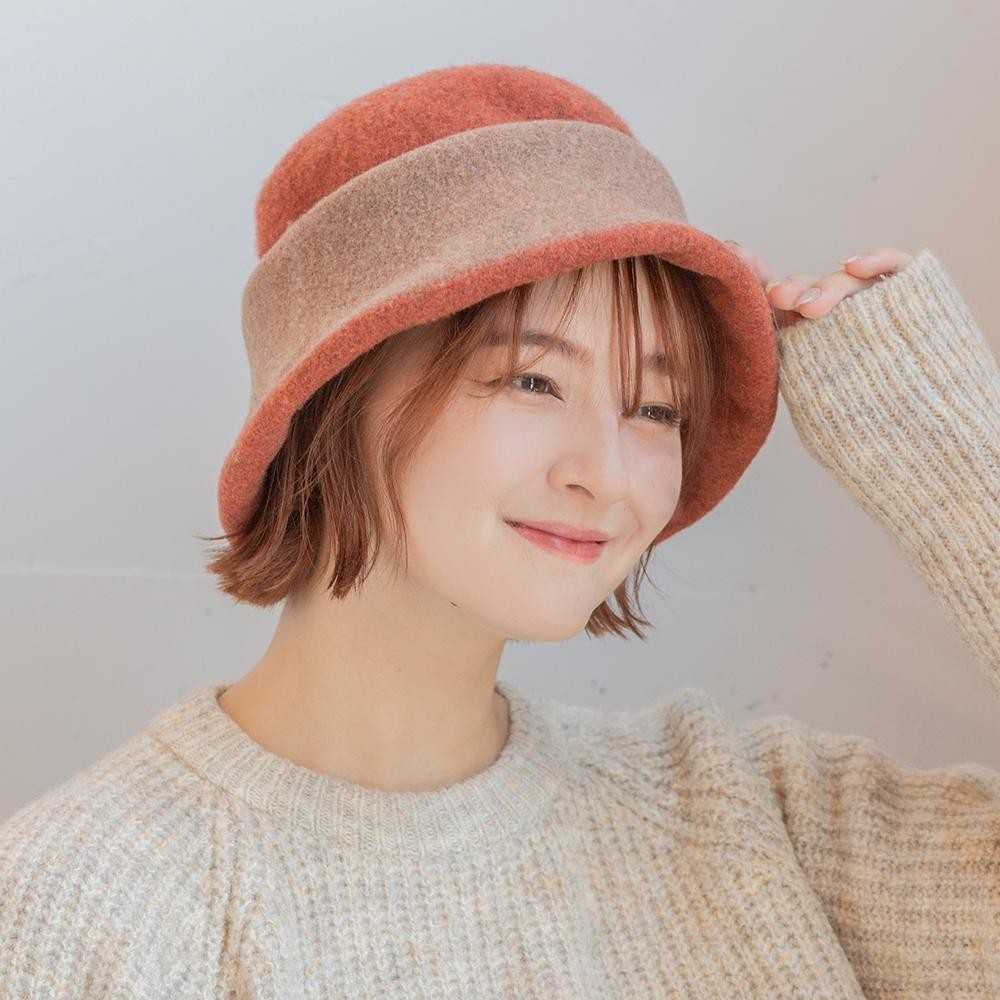 そのまま被ってすっぽりクロッシェスタイルや、裏返してツバを折り返すことでボーラーハット風、はたまた、くるくると折り返してトークベレー風などなど、