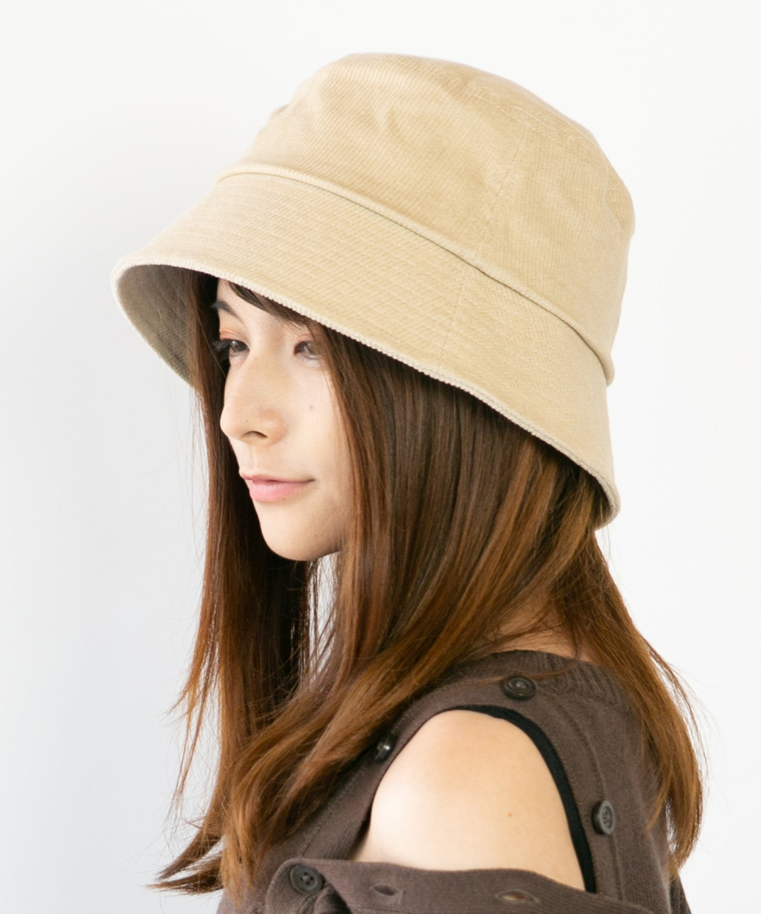 カジュアルダウンしすぎない細畝のコーデュロイに加え、横幅を抑えた小ぶりなシルエットで、今からのシーズンに日除けのツバ広ハットはちょっと…、という方でもおしゃれ感覚で使って頂きやすい、定番のバケットハットスタイルの帽子です。