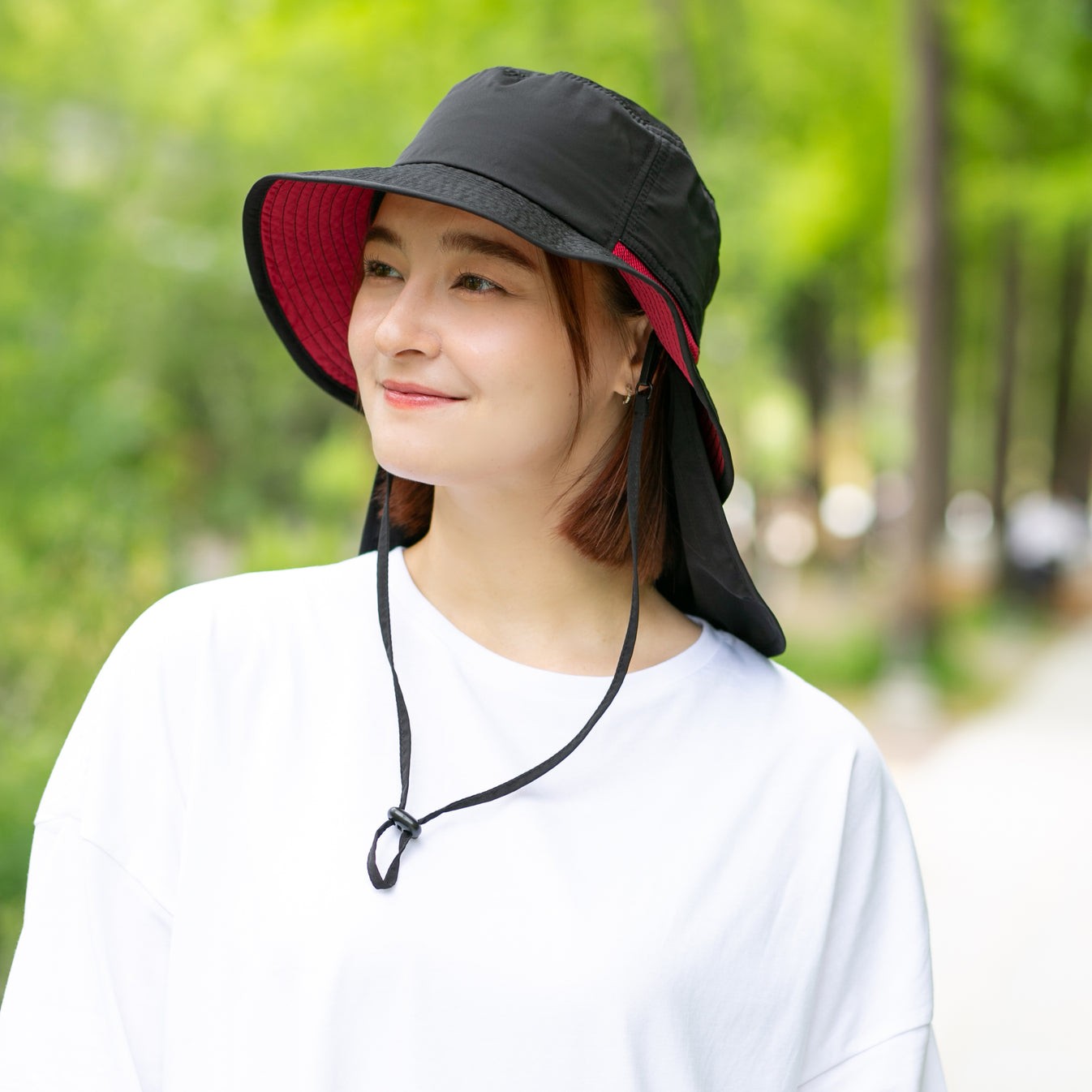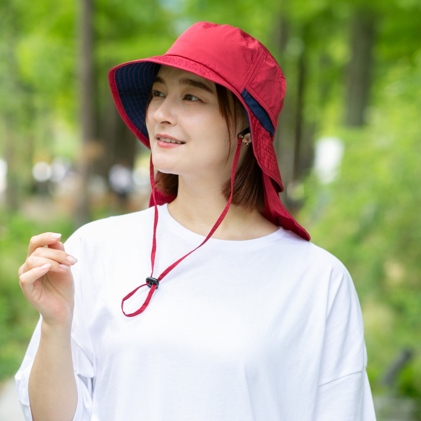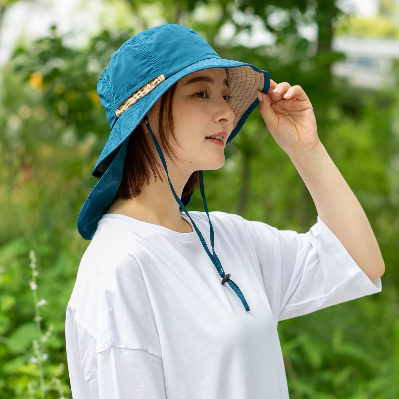 つば裏に遮光率100%の遮光芯地を使用しており、首やけ防止の収納式マントもついてUV対策もバッチリ!
