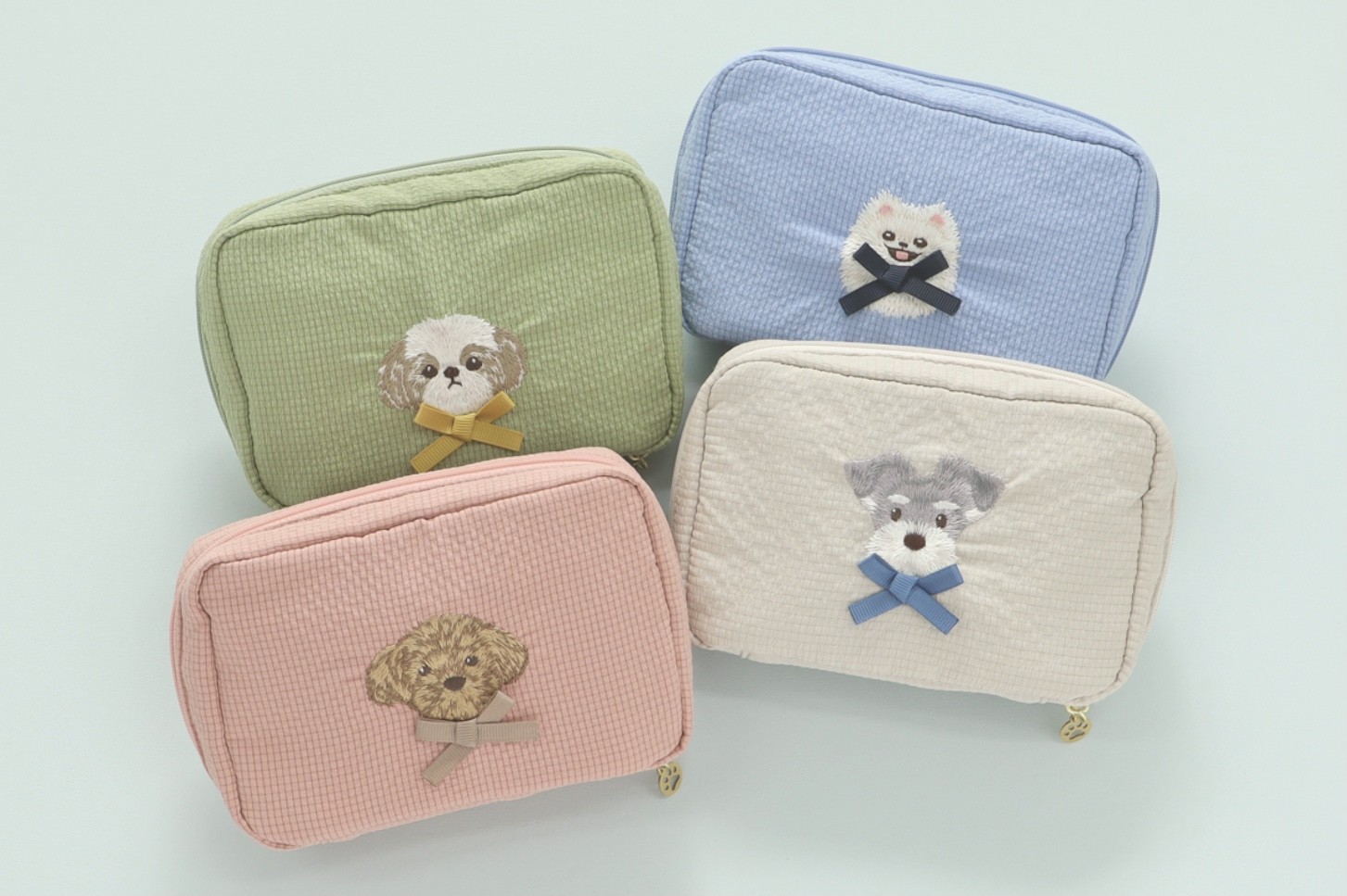 立体的なリボンを付けたワンちゃんの刺繍が愛らしい、ブルーブルーエオリジナルポーチ。