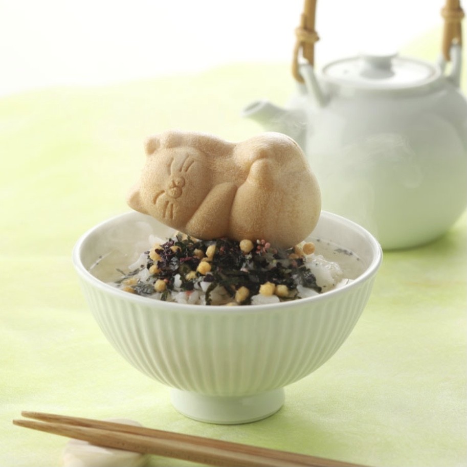 ねこのカタチのもなかに、お茶漬けを包みました。