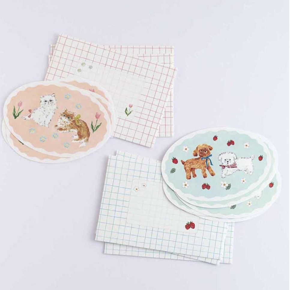 オーバル型の便箋とチェック柄に小さなお花が描かれた封筒がセットになっています。