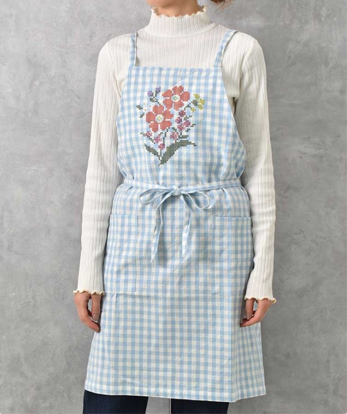 ギンガムチェック生地にクロスステッチ風プリントが施された可愛らしいアイテム。