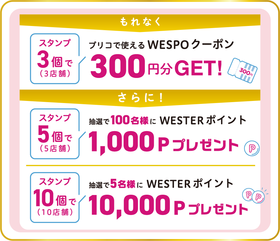 スタンプ3つ集めるともれなく、プリコで使えるWESPOクーポンプレゼント!